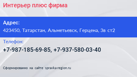 Интерьер плюс, фирма по адресу 423450, Татарстан, Альметьевск, Герцена, 3в ст2 в дальнейшем Организация, размещена в следующих категориях: