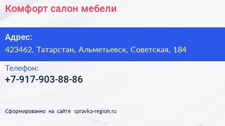 Комфорт, салон мебели по адресу 423462, Татарстан, Альметьевск, Советская, 184 в дальнейшем Организация, размещена в следующих категориях: