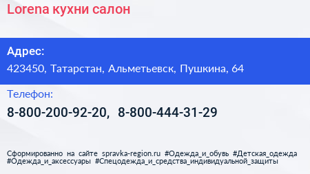 Lorena кухни, салон по адресу 423450, Татарстан, Альметьевск, Пушкина, 64 в дальнейшем Организация, размещена в следующих категориях: