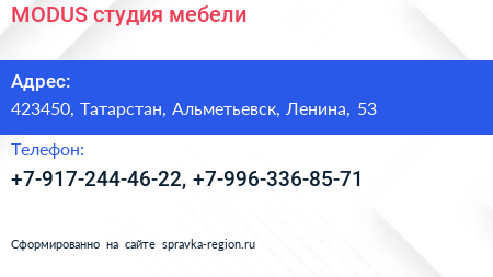 MODUS, студия мебели по адресу 423450, Татарстан, Альметьевск, Ленина, 53 в дальнейшем Организация, размещена в следующих категориях: