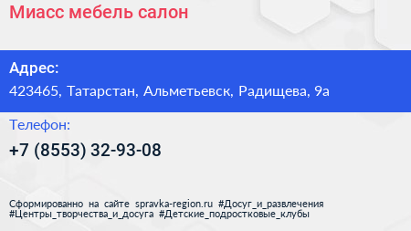 Миасс мебель, салон по адресу 423465, Татарстан, Альметьевск, Радищева, 9а в дальнейшем Организация, размещена в следующих категориях: