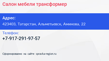 Салон мебели-трансформер по адресу 423403, Татарстан, Альметьевск, Аминова, 22 в дальнейшем Организация, размещена в следующих категориях: