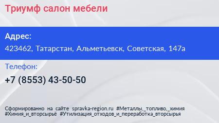 Триумф, салон мебели по адресу 423462, Татарстан, Альметьевск, Советская, 147а в дальнейшем Организация, размещена в следующих категориях: