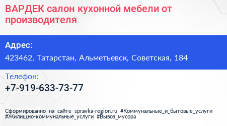 ВАРДЕК, салон кухонной мебели от производителя по адресу 423462, Татарстан, Альметьевск, Советская, 184 в дальнейшем Организация, размещена в следующих категориях: