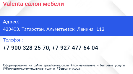 Valenta, салон мебели по адресу 423403, Татарстан, Альметьевск, Ленина, 112 в дальнейшем Организация, размещена в следующих категориях: