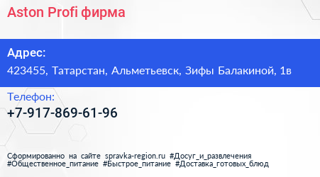 Aston Profi, фирма по адресу 423455, Татарстан, Альметьевск, Зифы Балакиной, 1в в дальнейшем Организация, размещена в следующих категориях: