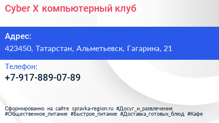 Cyber: X, компьютерный клуб по адресу 423450, Татарстан, Альметьевск, Гагарина, 21 в дальнейшем Организация, размещена в следующих категориях: