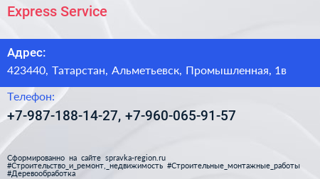 Express Service по адресу 423440, Татарстан, Альметьевск, Промышленная, 1в в дальнейшем Организация, размещена в следующих категориях:
