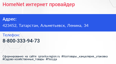 HomeNet, интернет-провайдер по адресу 423452, Татарстан, Альметьевск, Ленина, 34 в дальнейшем Организация, размещена в следующих категориях: