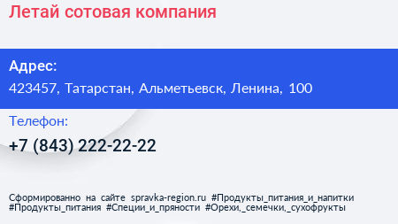 Летай, сотовая компания по адресу 423457, Татарстан, Альметьевск, Ленина, 100 в дальнейшем Организация, размещена в следующих категориях: