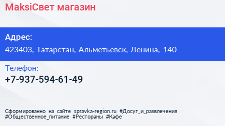 MaksiСвет, магазин по адресу 423403, Татарстан, Альметьевск, Ленина, 140 в дальнейшем Организация, размещена в следующих категориях: