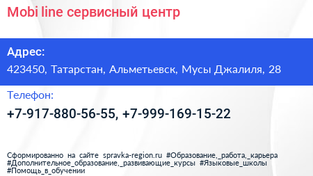 Mobi line, сервисный центр по адресу 423450, Татарстан, Альметьевск, Мусы Джалиля, 28 в дальнейшем Организация, размещена в следующих категориях: