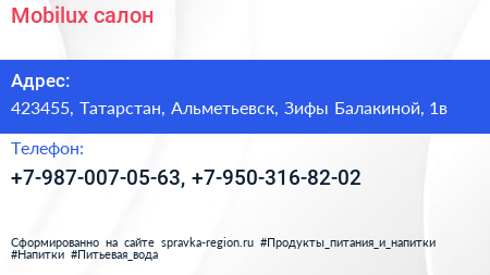Mobilux, салон по адресу 423455, Татарстан, Альметьевск, Зифы Балакиной, 1в в дальнейшем Организация, размещена в следующих категориях: