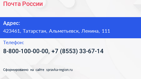 Почта России по адресу 423461, Татарстан, Альметьевск, Ленина, 111 в дальнейшем Организация, размещена в следующих категориях: