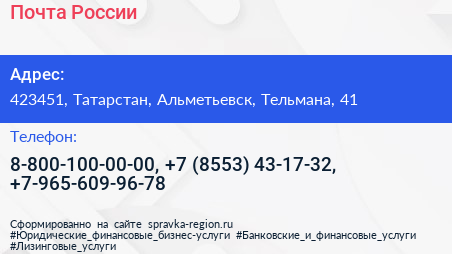 Почта России по адресу 423451, Татарстан, Альметьевск, Тельмана, 41 в дальнейшем Организация, размещена в следующих категориях: