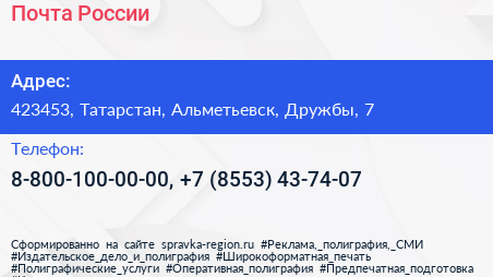 Почта России по адресу 423453, Татарстан, Альметьевск, Дружбы, 7 в дальнейшем Организация, размещена в следующих категориях: