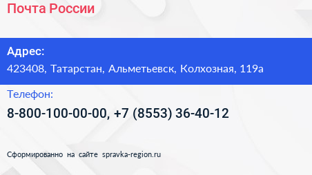 Почта России по адресу 423408, Татарстан, Альметьевск, Колхозная, 119а в дальнейшем Организация, размещена в следующих категориях: