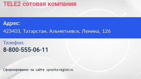 TELE2, сотовая компания по адресу 423403, Татарстан, Альметьевск, Ленина, 126 в дальнейшем Организация, размещена в следующих категориях: