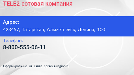 TELE2, сотовая компания по адресу 423457, Татарстан, Альметьевск, Ленина, 100 в дальнейшем Организация, размещена в следующих категориях: