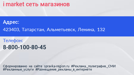 i-market, сеть магазинов по адресу 423403, Татарстан, Альметьевск, Ленина, 132 в дальнейшем Организация, размещена в следующих категориях: