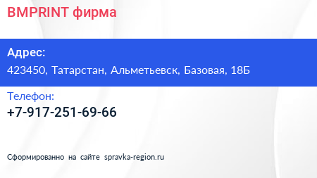 BMPRINT, фирма по адресу 423450, Татарстан, Альметьевск, Базовая, 18Б в дальнейшем Организация, размещена в следующих категориях: