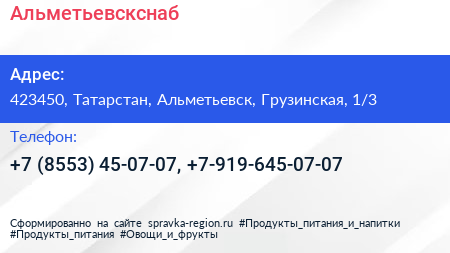 Альметьевскснаб по адресу 423450, Татарстан, Альметьевск, Грузинская, 1/3 в дальнейшем Организация, размещена в следующих категориях: