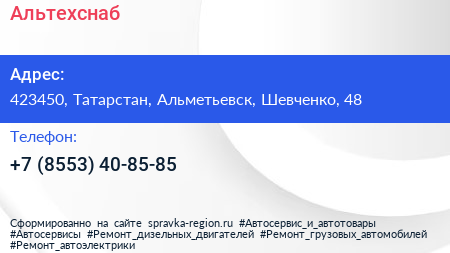 Альтехснаб по адресу 423450, Татарстан, Альметьевск, Шевченко, 48 в дальнейшем Организация, размещена в следующих категориях: