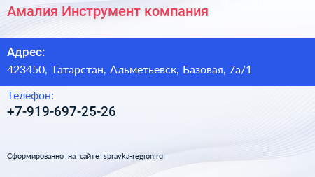 Амалия Инструмент, компания по адресу 423450, Татарстан, Альметьевск, Базовая, 7а/1 в дальнейшем Организация, размещена в следующих категориях: