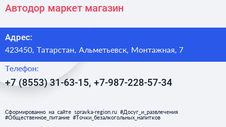 Автодор маркет, магазин по адресу 423450, Татарстан, Альметьевск, Монтажная, 7 в дальнейшем Организация, размещена в следующих категориях: