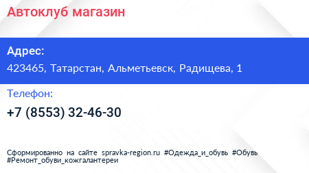 Автоклуб, магазин по адресу 423465, Татарстан, Альметьевск, Радищева, 1 в дальнейшем Организация, размещена в следующих категориях: