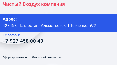 Чистый Воздух, компания по адресу 423458, Татарстан, Альметьевск, Шевченко, 9/2 в дальнейшем Организация, размещена в следующих категориях: