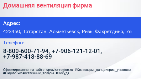 Домашняя вентиляция, фирма по адресу 423450, Татарстан, Альметьевск, Ризы Фахретдина, 76 в дальнейшем Организация, размещена в следующих категориях: