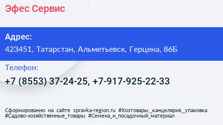 Эфес-Сервис по адресу 423451, Татарстан, Альметьевск, Герцена, 86Б в дальнейшем Организация, размещена в следующих категориях: