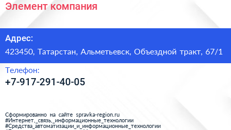 Элемент, компания по адресу 423450, Татарстан, Альметьевск, Объездной тракт, 67/1 в дальнейшем Организация, размещена в следующих категориях:
