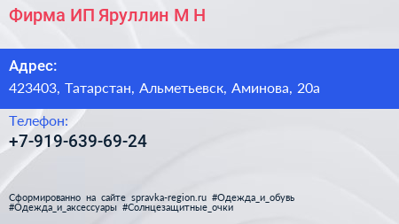Фирма, ИП Яруллин М.Н. по адресу 423403, Татарстан, Альметьевск, Аминова, 20а в дальнейшем Организация, размещена в следующих категориях: