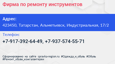 Фирма по ремонту инструментов по адресу 423450, Татарстан, Альметьевск, Индустриальная, 17/2 в дальнейшем Организация, размещена в следующих категориях: