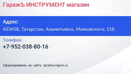 ГаражЪ ИНСТРУМЕНТ, магазин по адресу 423458, Татарстан, Альметьевск, Маяковского, 118 в дальнейшем Организация, размещена в следующих категориях: