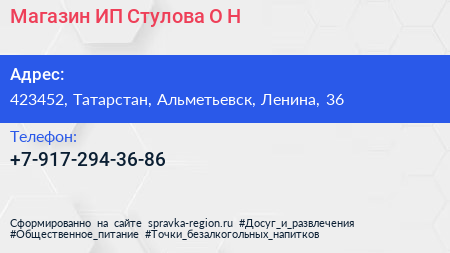 Магазин, ИП Стулова О.Н. по адресу 423452, Татарстан, Альметьевск, Ленина, 36 в дальнейшем Организация, размещена в следующих категориях: