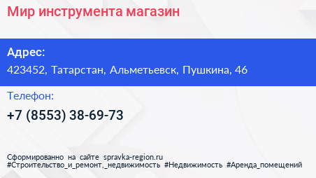 Мир инструмента, магазин по адресу 423452, Татарстан, Альметьевск, Пушкина, 46 в дальнейшем Организация, размещена в следующих категориях: