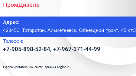 ПромДизель по адресу 423450, Татарстан, Альметьевск, Объездной тракт, 45 ст3 в дальнейшем Организация, размещена в следующих категориях: