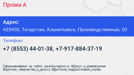 Прома-А по адресу 423450, Татарстан, Альметьевск, Производственная, 10 в дальнейшем Организация, размещена в следующих категориях: