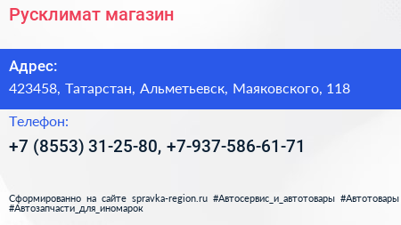 Русклимат, магазин по адресу 423458, Татарстан, Альметьевск, Маяковского, 118 в дальнейшем Организация, размещена в следующих категориях: