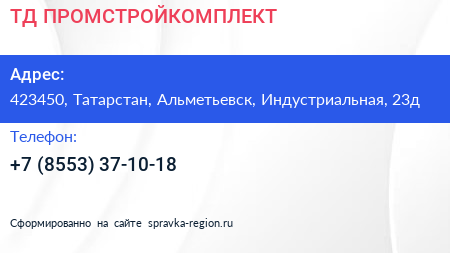 ТД ПРОМСТРОЙКОМПЛЕКТ по адресу 423450, Татарстан, Альметьевск, Индустриальная, 23д в дальнейшем Организация, размещена в следующих категориях: