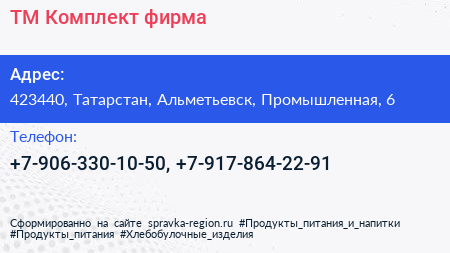 ТМ Комплект, фирма по адресу 423440, Татарстан, Альметьевск, Промышленная, 6 в дальнейшем Организация, размещена в следующих категориях: