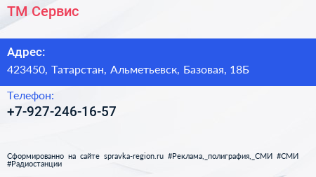 ТМ-Сервис по адресу 423450, Татарстан, Альметьевск, Базовая, 18Б в дальнейшем Организация, размещена в следующих категориях:
