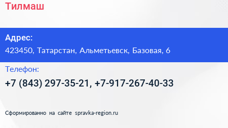 Тилмаш по адресу 423450, Татарстан, Альметьевск, Базовая, 6 в дальнейшем Организация, размещена в следующих категориях: