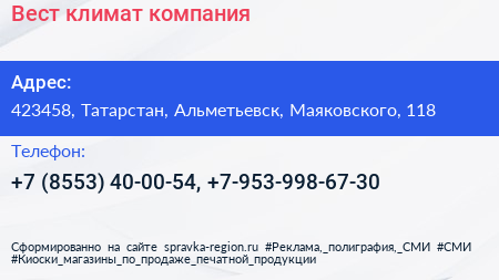 Вест климат, компания по адресу 423458, Татарстан, Альметьевск, Маяковского, 118 в дальнейшем Организация, размещена в следующих категориях: