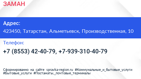 ЗАМАН по адресу 423450, Татарстан, Альметьевск, Производственная, 10 в дальнейшем Организация, размещена в следующих категориях: