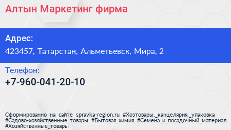 Алтын-Маркетинг, фирма по адресу 423457, Татарстан, Альметьевск, Мира, 2 в дальнейшем Организация, размещена в следующих категориях: