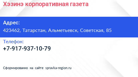 Хэзинэ, корпоративная газета по адресу 423462, Татарстан, Альметьевск, Советская, 85 в дальнейшем Организация, размещена в следующих категориях: